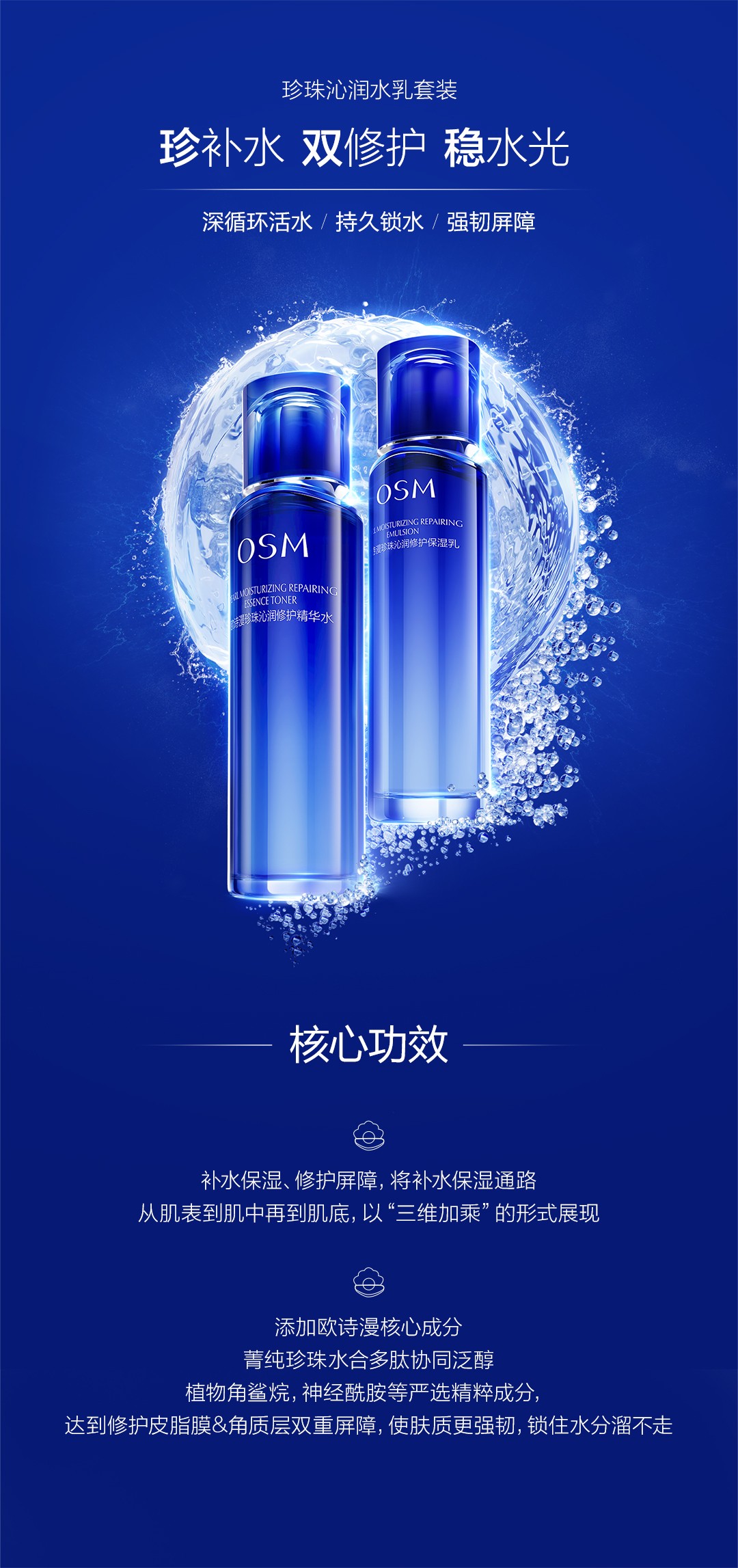 補水保濕、修護屏障,將補水保濕通路從肌表到肌中再到肌底,以“三維加乘”的形式展現。 添加歐詩漫核心成分菁純珍珠水合多肽協同泛醇,植物角鯊烷,神經酰胺等嚴選精粹成分,達到修護皮脂膜&角質層雙重屏障,使膚質更強韌,鎖住水分溜不走。
