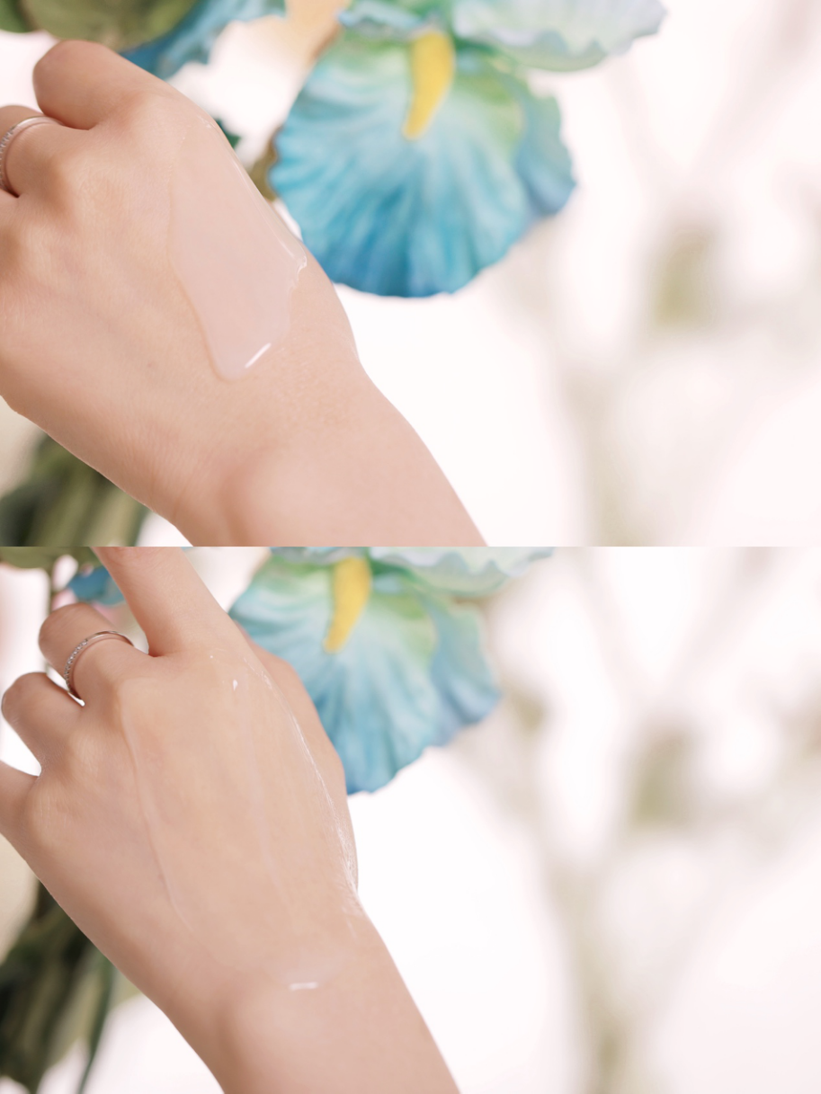 歐詩漫小白燈美白精華液還帶有珍珠般光澤,香味 有一種特別的中式典雅,使人愉悅,涂在皮膚上感 覺質地水潤,簡單打圈就能快速吸收,感覺皮膚瞬 間喝飽水,立刻變得清透明亮,效果明顯。